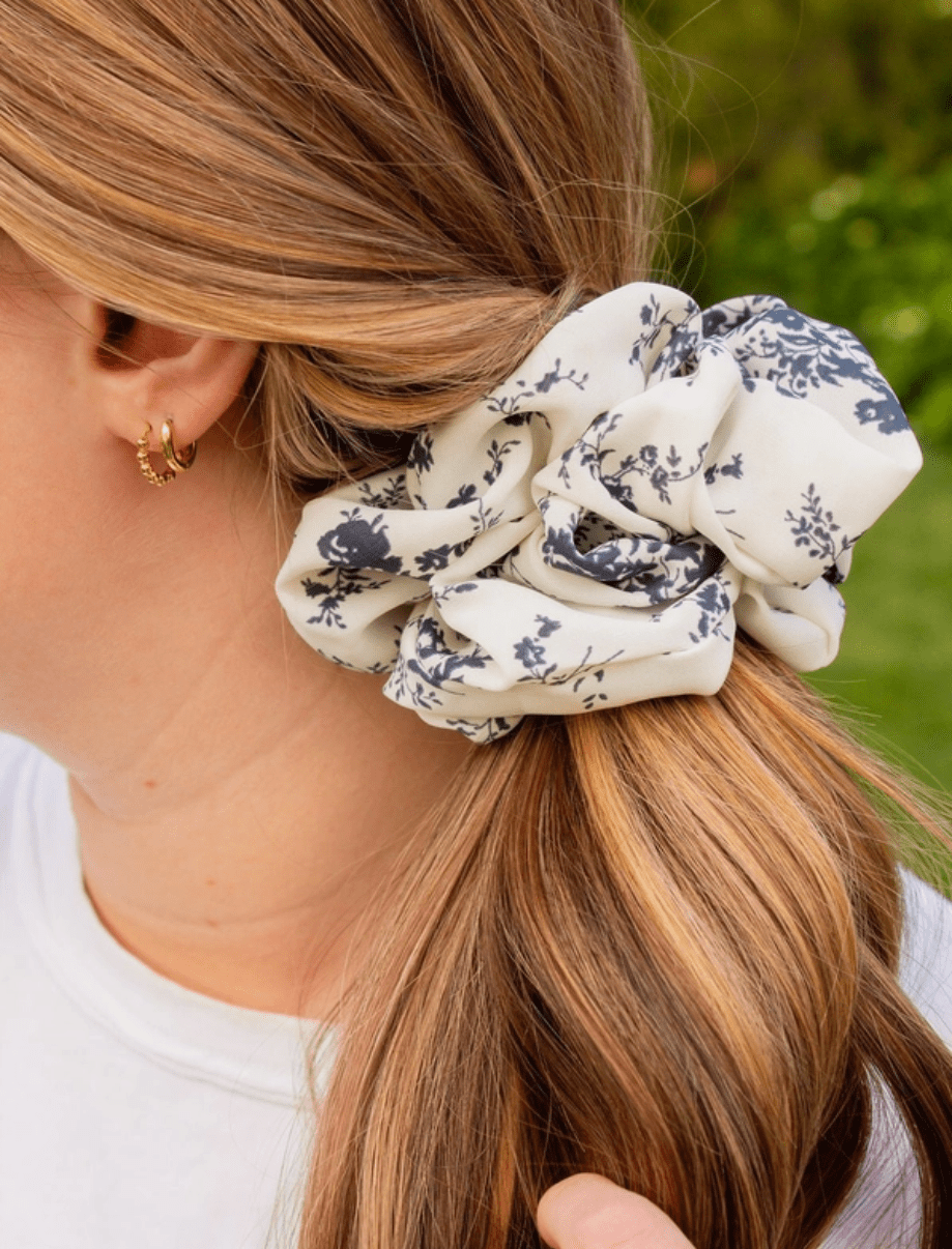 Ce chouchou géant sera le complément idéal de votre garde-robe! Confectionné dans un tissu doux et soyeux, il arbore un imprimé floral crème et bleu. Il est doux au toucher et agréable pour vos cheveux. Il s'adapte à toutes vos envies de coiffure et apportera une touche de charme et de rêve à toutes vos tenues.