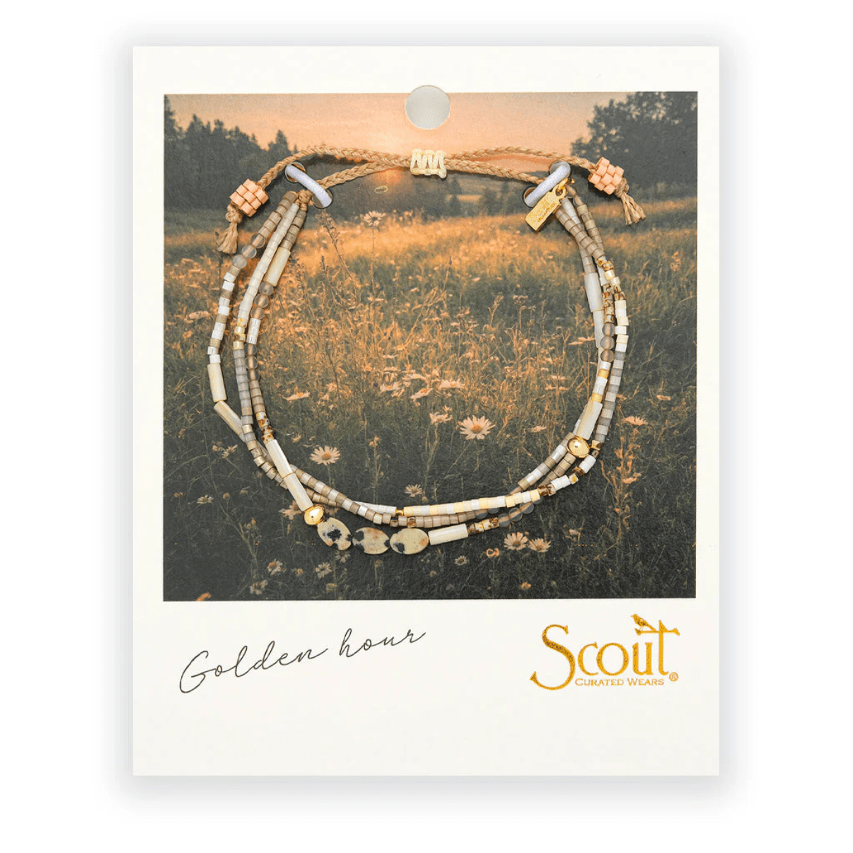 La pierre semi-précieuse et sa signification sont mises en valeur au verso de chaque carte et font écho à la photographie figurant au recto. Chaque bracelet, à porter seul ou à superposer, associe des pierres semi-précieuses à des perles de verre japonaises Miyuki.