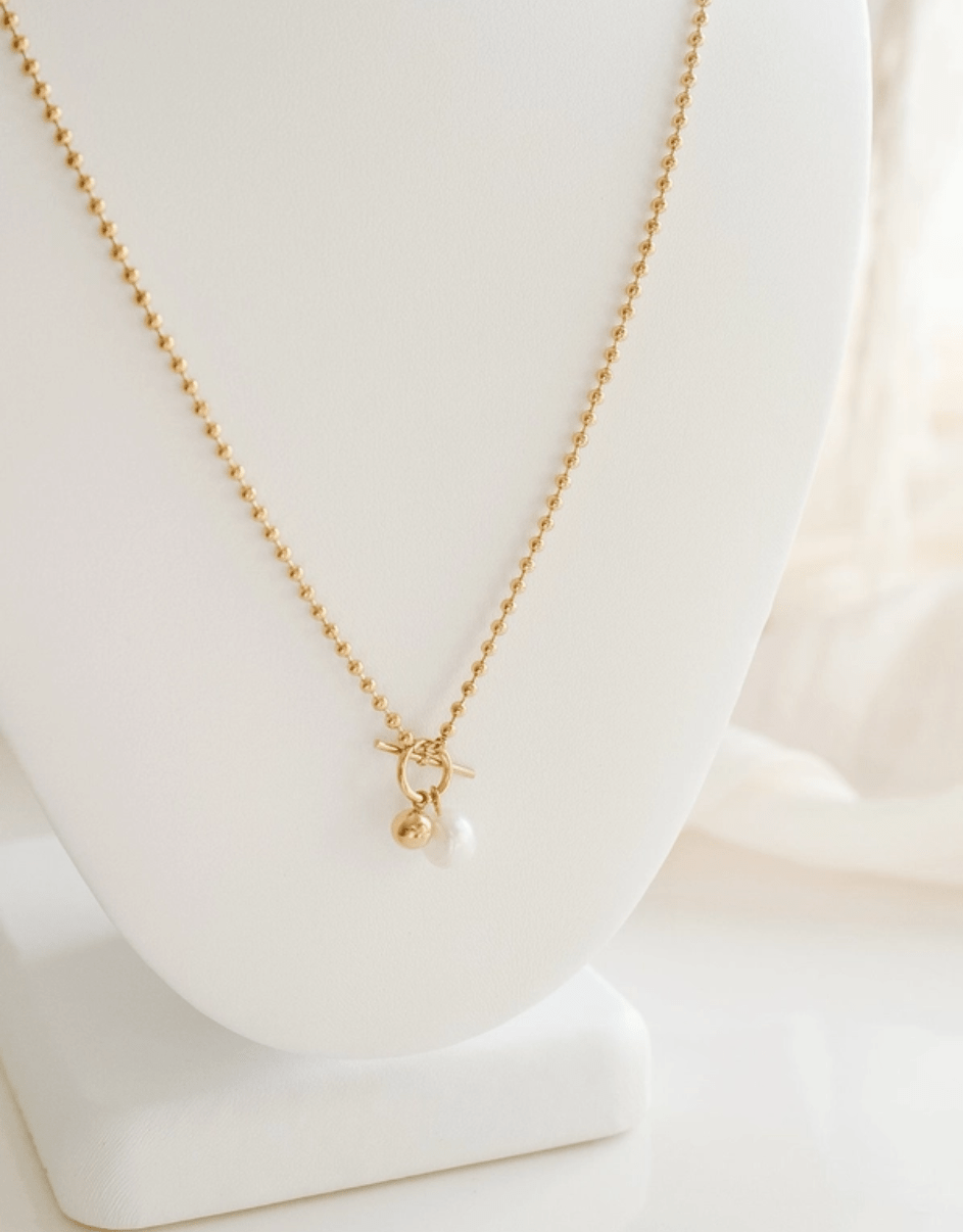 Élevez votre style avec notre magnifique collier, orné d'une superbe perle et d'accents dorés chics. Cette pièce élégante est conçue avec un fermoir à bascule tendance. Facile à porter tout et qui ajoute une touche mode. Parfait pour superposer sur des pulls ou des chemises à col montant, il rehausse sans effort n'importe quelle tenue avec son charme sophistiqué.