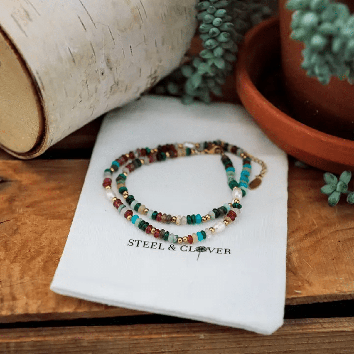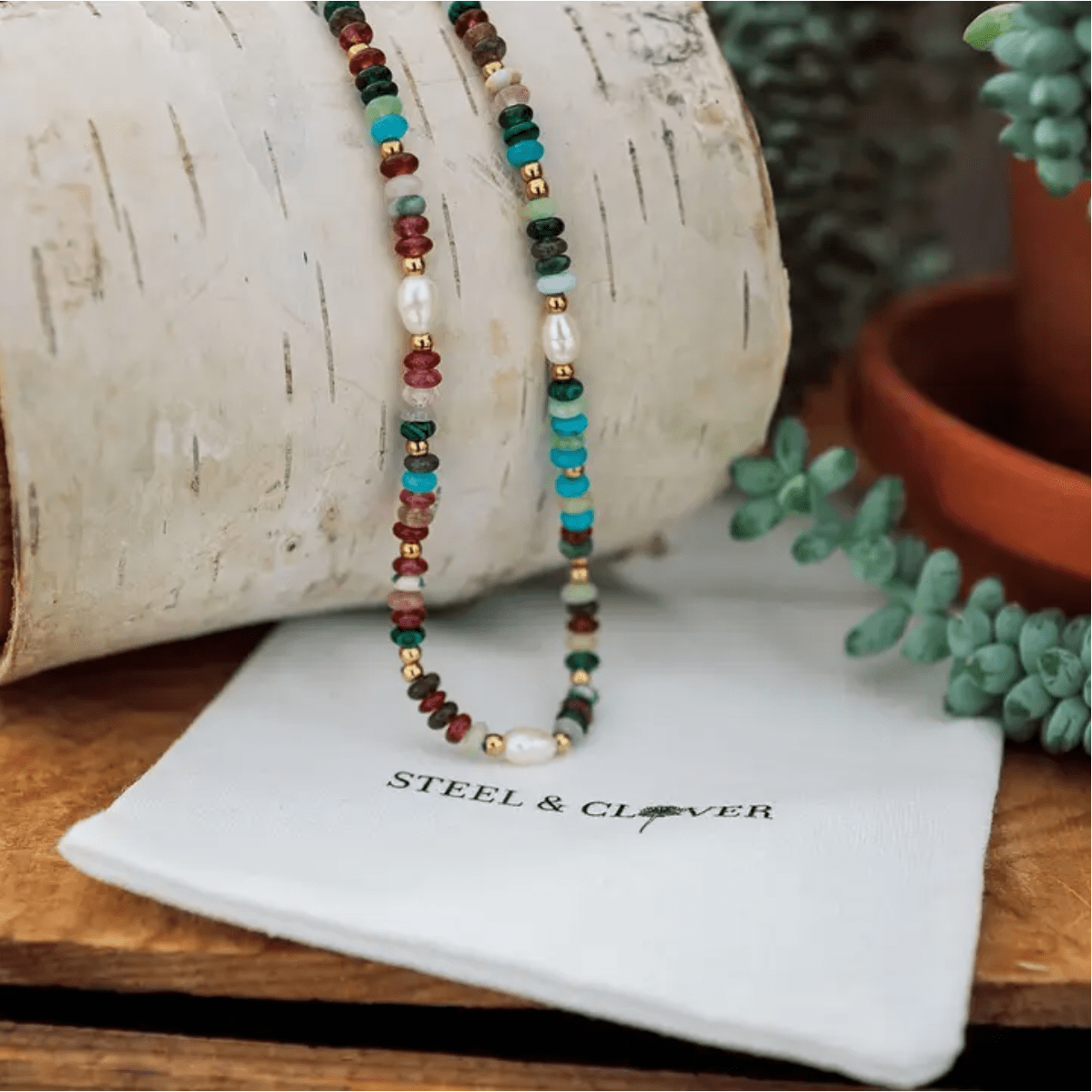 Ajoutez une touche de couleur, de chaleur et de charme à votre tenue avec le collier en pierres Marie-Reine. Confectionné avec des pierres naturelles éclatantes, ce collier apporte une touche d'élégance rustique à votre look. Parfait pour être superposé à d'autres colliers ou comme pièce maîtresse, il offre une façon élégante et simple de rehausser n'importe quelle tenue.