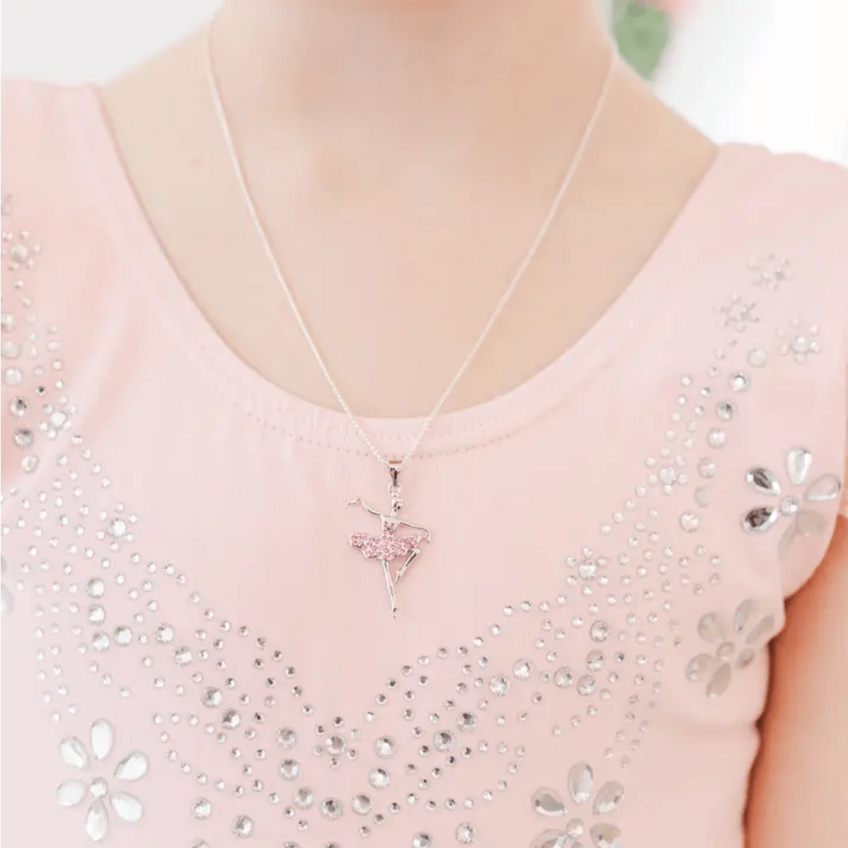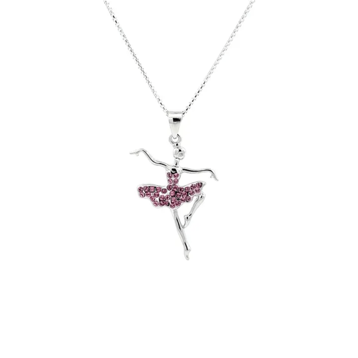Adorable collier à breloque en argent sterling représentant une ballerine, orné de cristaux autrichiens roses étincelants de haute qualité.