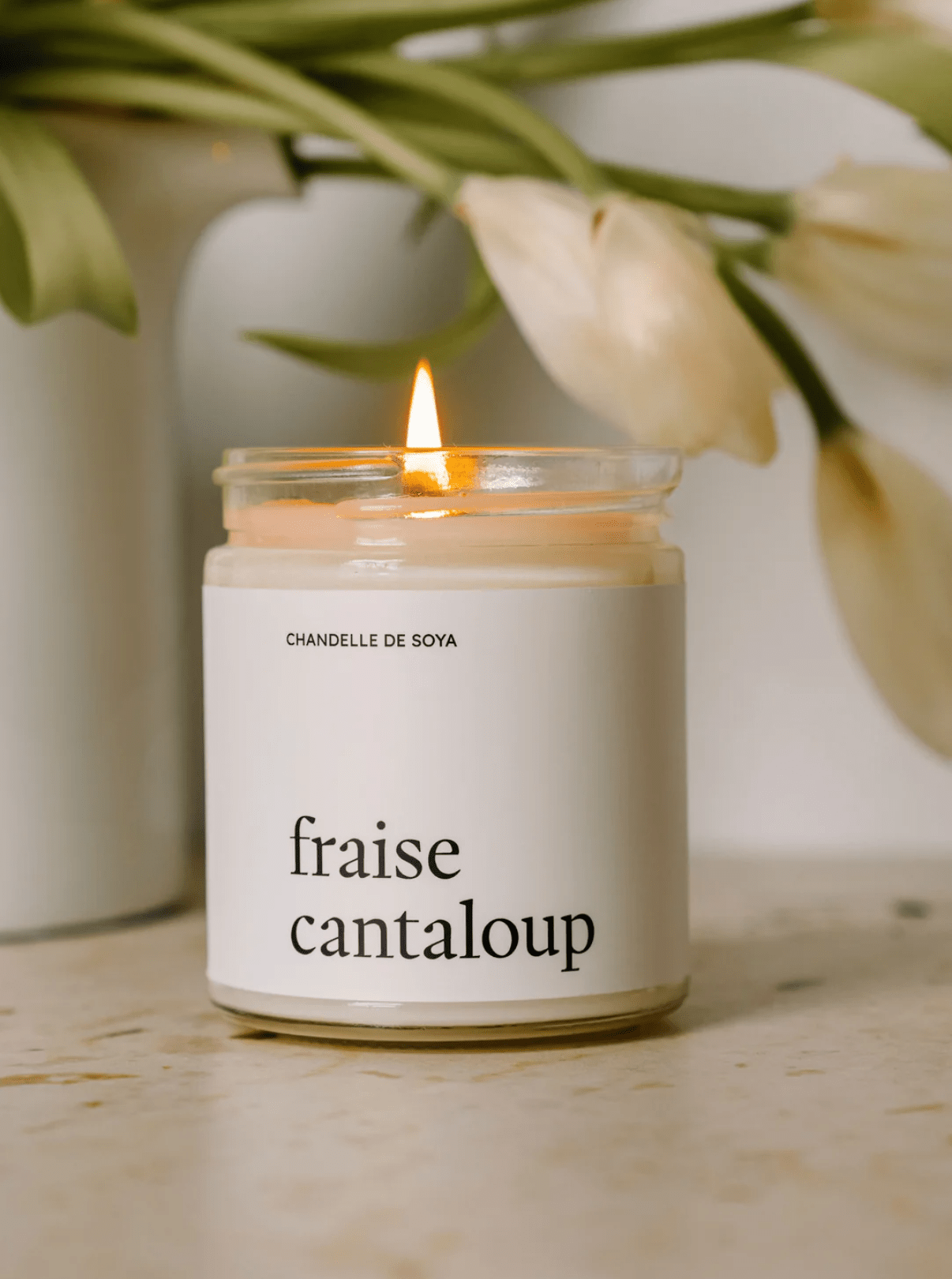 Découvrez la chandelle de soya Fraise cantaloup, un mariage rafraîchissant entre la douceur estivale de la fraise et la fraîcheur juteuse du cantaloup.