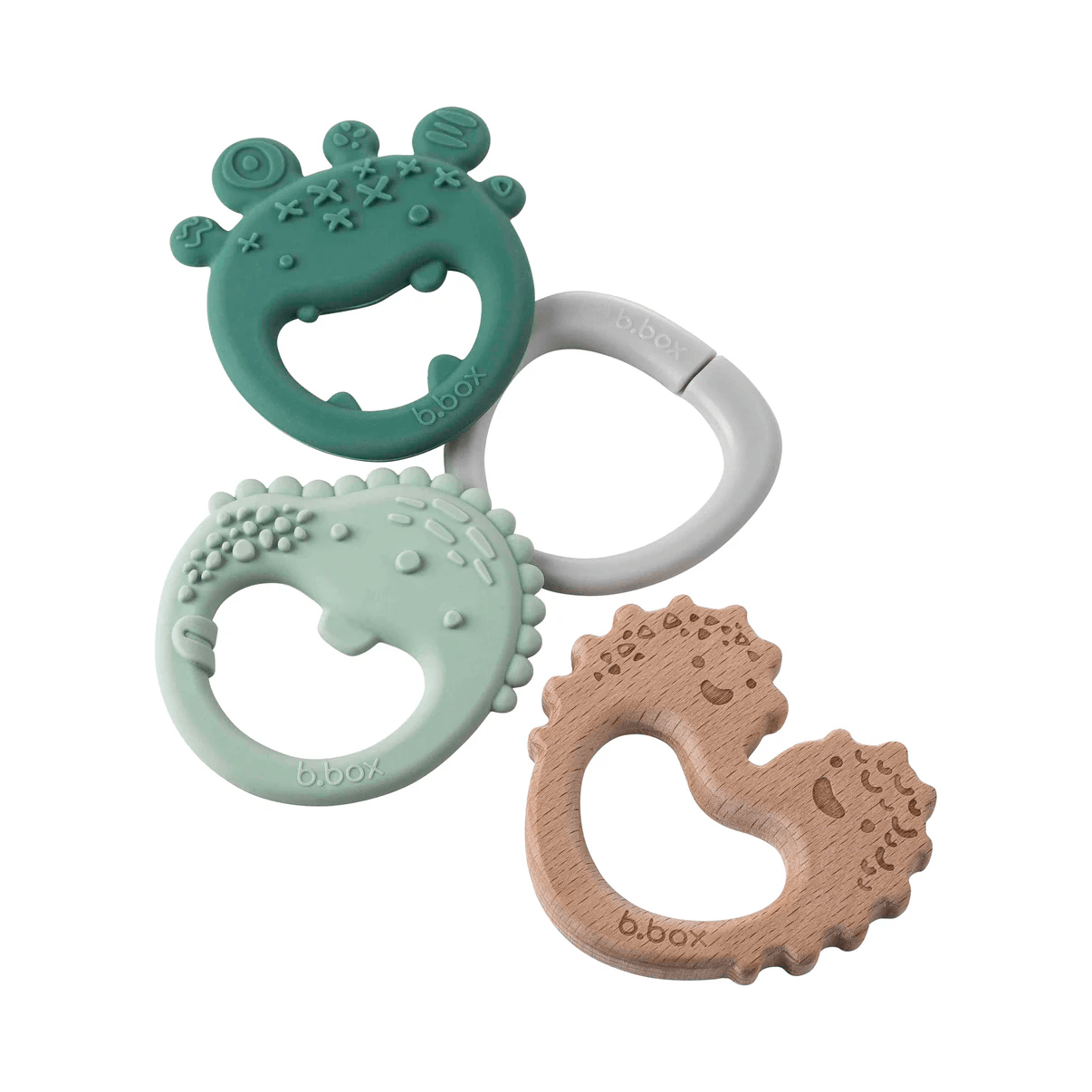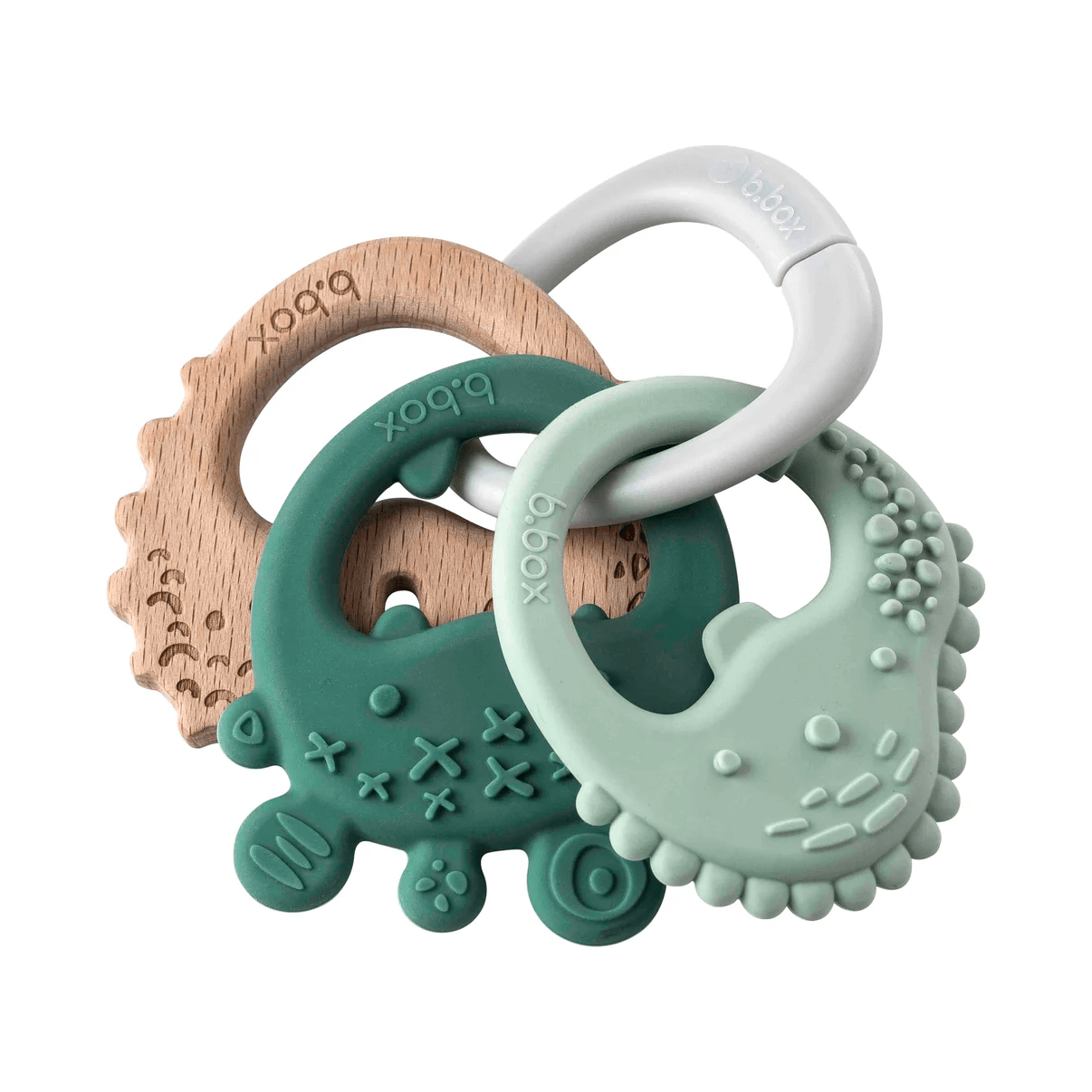 Le trio d'anneaux de dentition est composé de trois anneaux texturés montés sur un anneau pratique, offrant le choix entre silicone et bois de hêtre tout au long de la poussée dentaire.