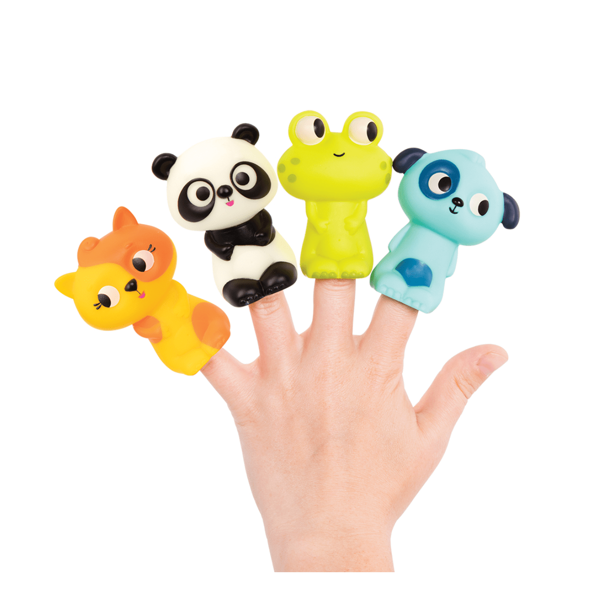Cet ensemble comprend 4 marionnettes de doigts imperméables - un chat, un panda, un chien et une grenouille.