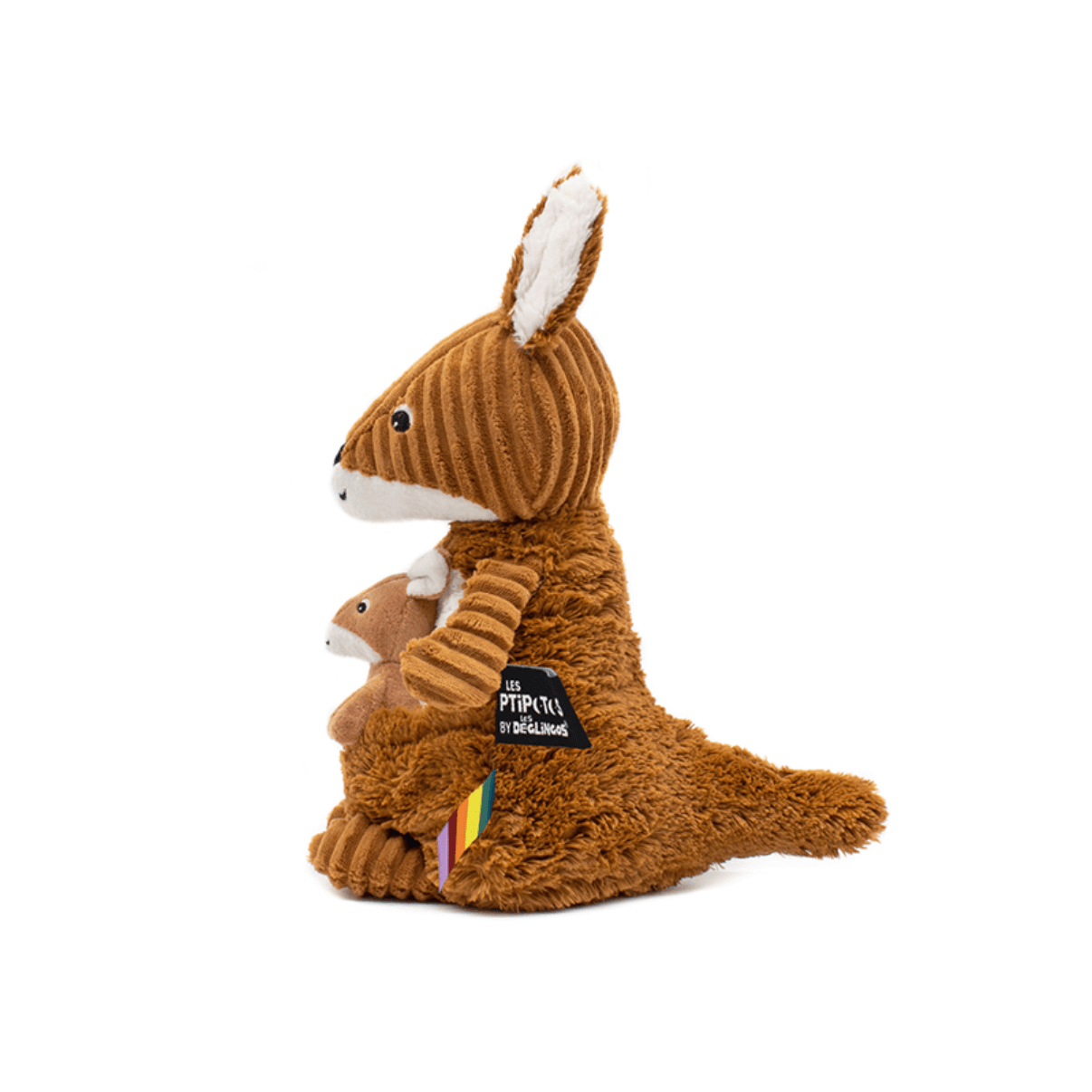 Cette peluche kangourou couleur marron cassonade de 30 cm est en velours côtelé et soft tout doux.