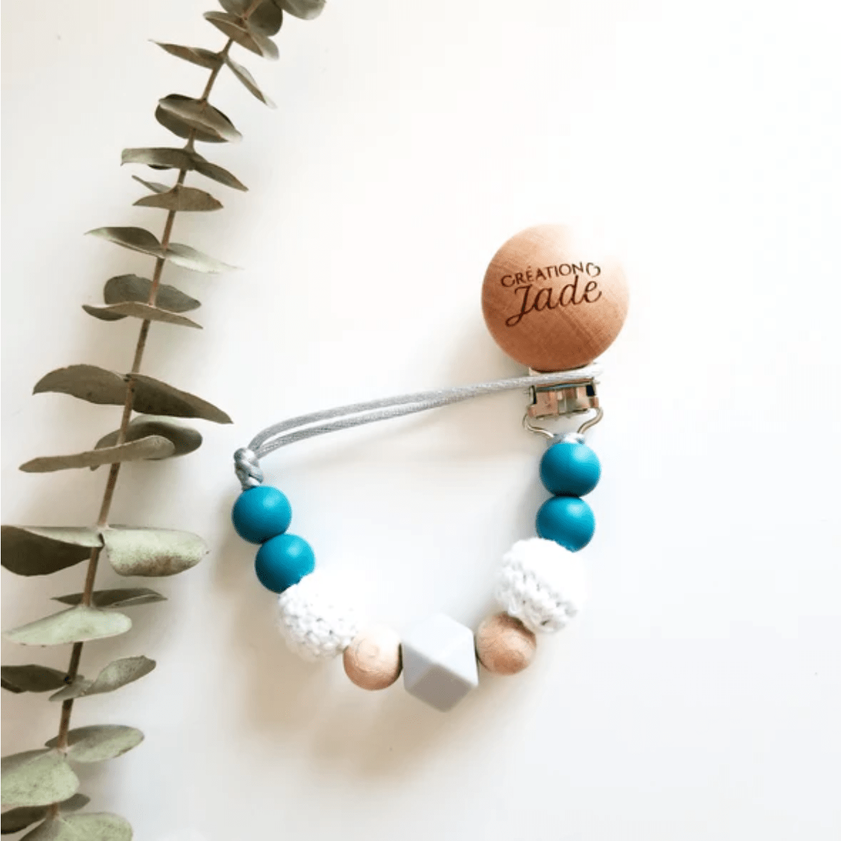 Fini de chercher la suce de bébé, au pire moment, avec cette belle attache-suce de modèle Centrée. Elle permet de maintenir la suce de bébé à la portée de main de celui-ci.