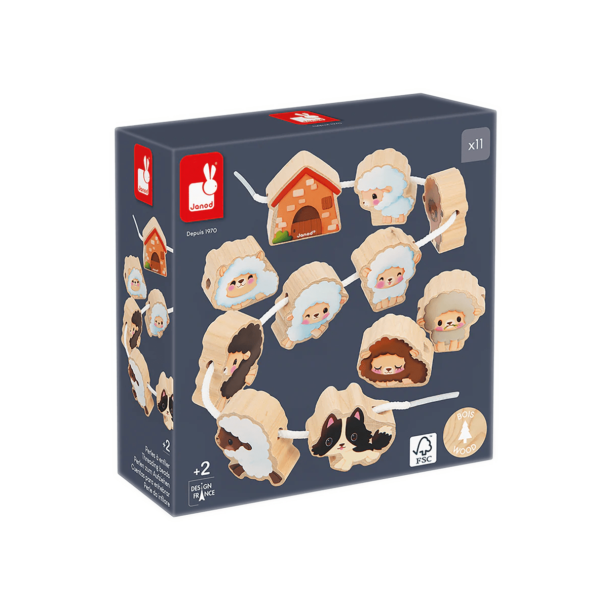 Ce jouet d’éveil se compose de 11 pièces en bois (9 moutons, 1 chien, 1 maisonnette) et de 2 cordons. On retrouve des embouts rigides à l’extrémité de chaque cordon pour faciliter le passage des perles, idéal pour les petites mains potelées!