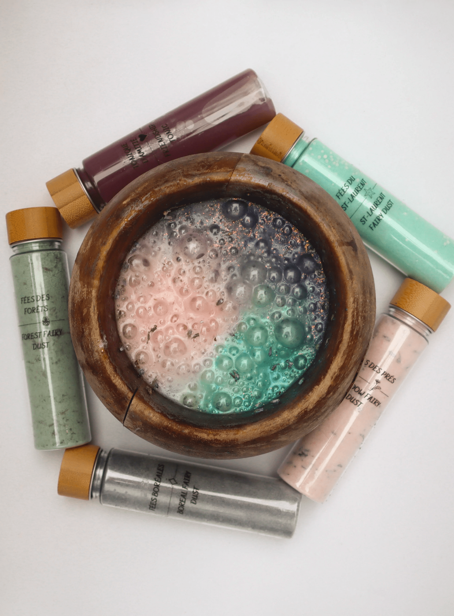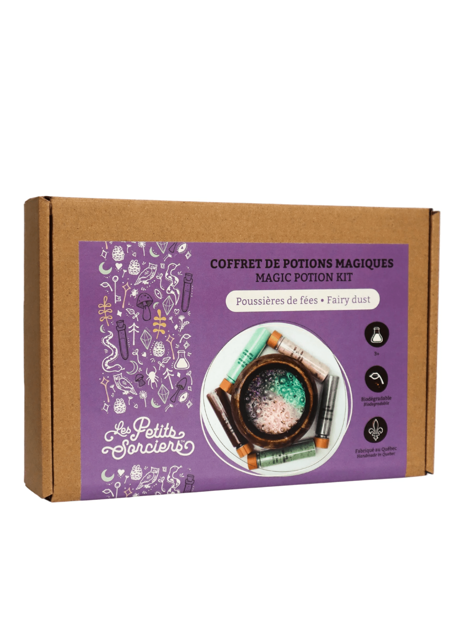 Ce coffret inclut quatre poussières de fées, chacune possédant des pouvoirs magiques spéciaux. Pour les petits sorciers souhaitant créer une potion d'amour propre, c'est la poussière de fées des prés qui devra être utilisée. Pour créer une potion de protection, la poussière de fées des forêts répondra à votre besoin.