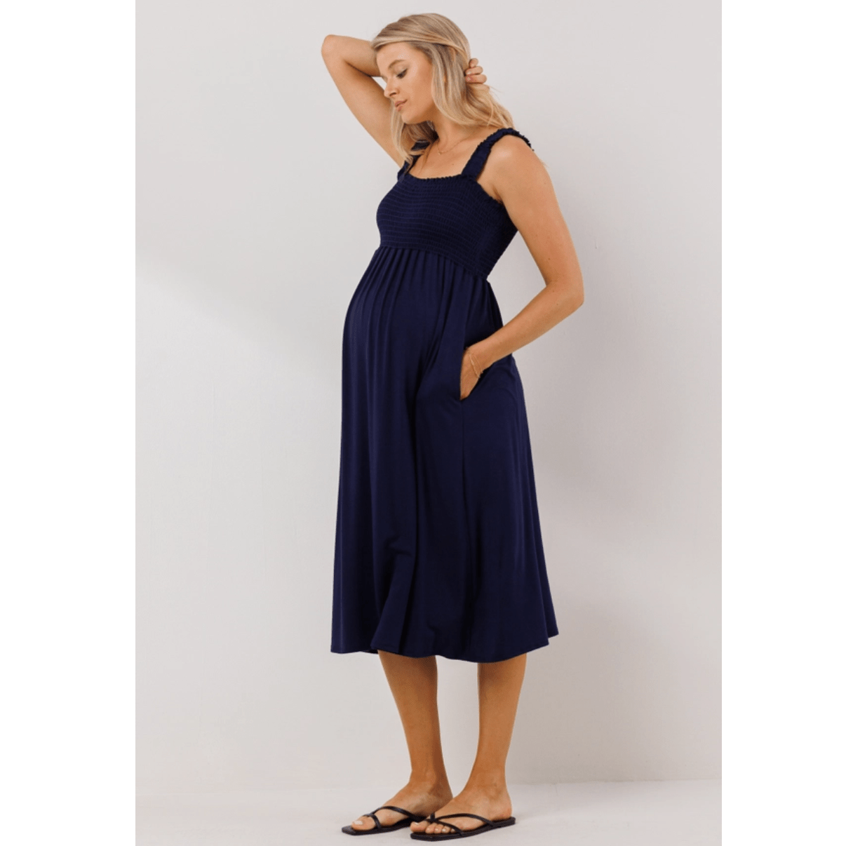 Robe légère et en toute simplicité. Robe de maternité midi sans manches à encolure carrée.