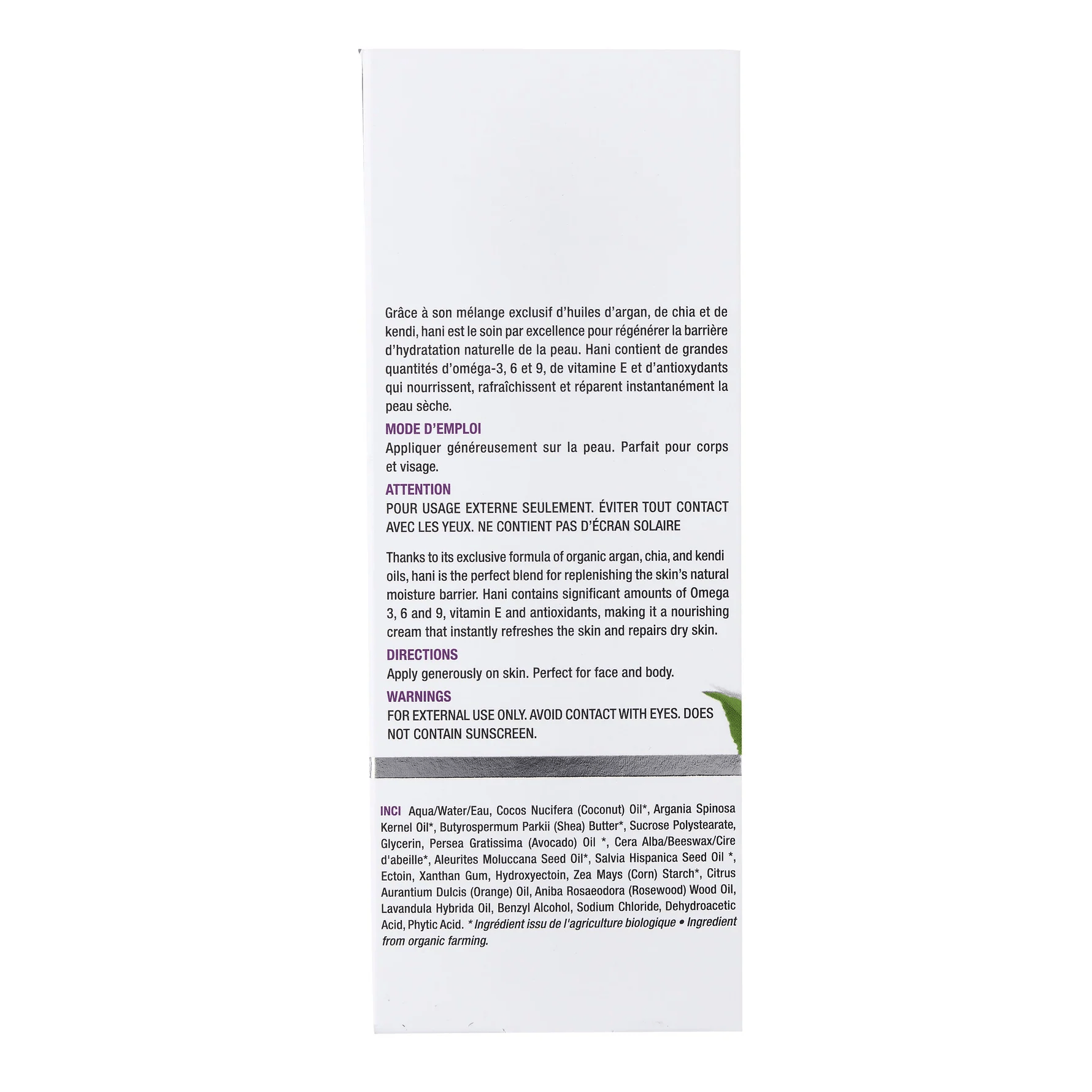 Hani contient de grandes quantités d'oméga 3,6 et 9, de la vitamine E et des antioxydants pour nourrir, apaiser et calmer les rougeurs de la peau.
