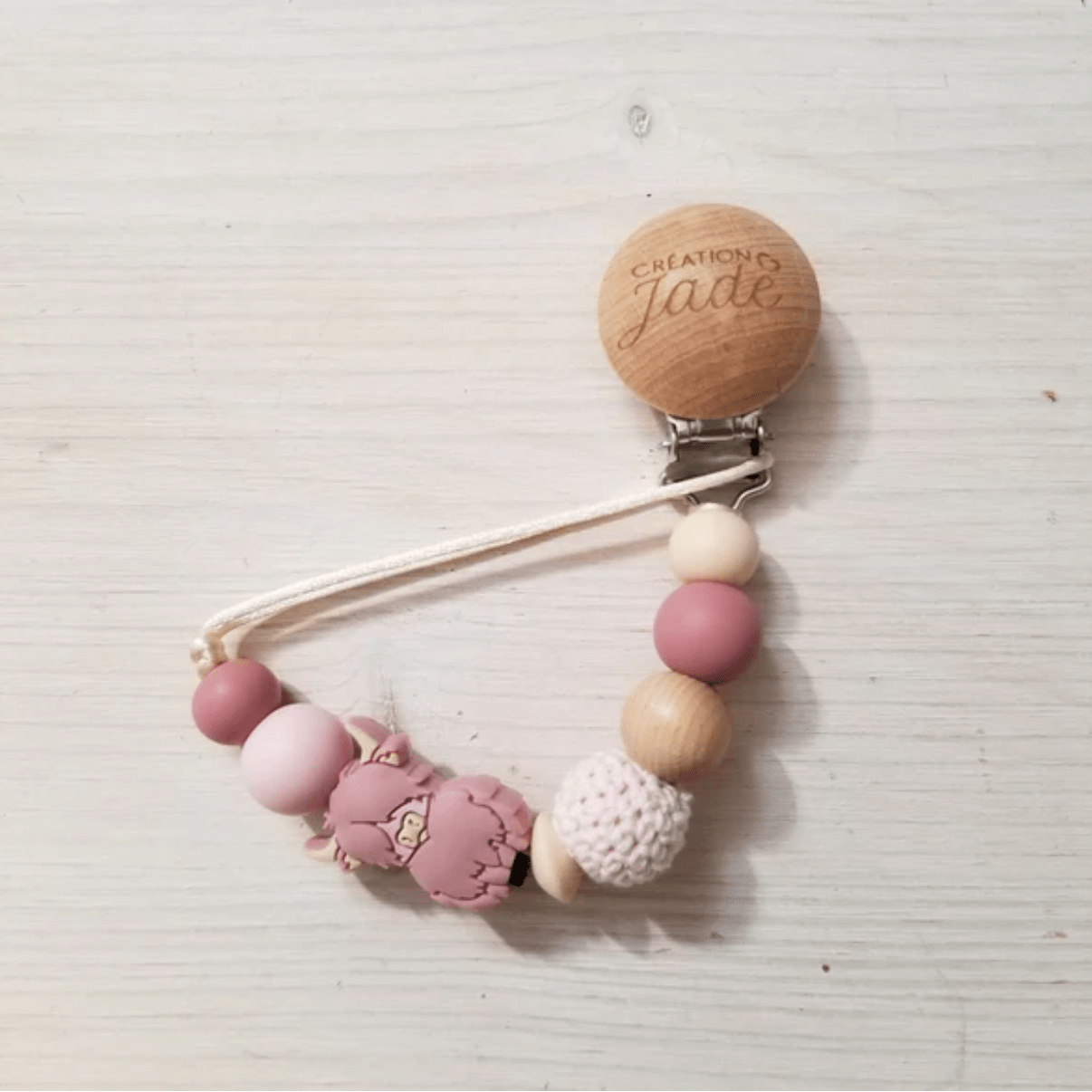 Lavez l'attache-suce à la main avant la première utilisation, avec de l'eau et du savon doux, mais ne submergez pas les pièces en bois ou en métal dans l'eau. Le lavage à la débarbouillette est conseillé si le produit contient du bois ou du métal. Possibilité de mettre une fine couche d'huile de noix de coco et/ou de la cire d'abeille, afin d'hydrater et protéger le bois.
