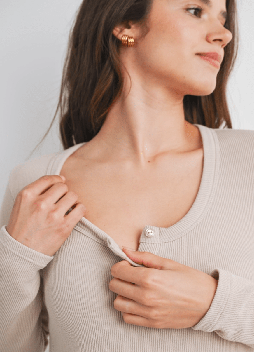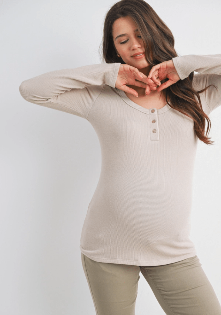 Haut col dégagé avec manches longues. Coupe ajustée pour mettre vos courbes en valeur pendant la maternité.